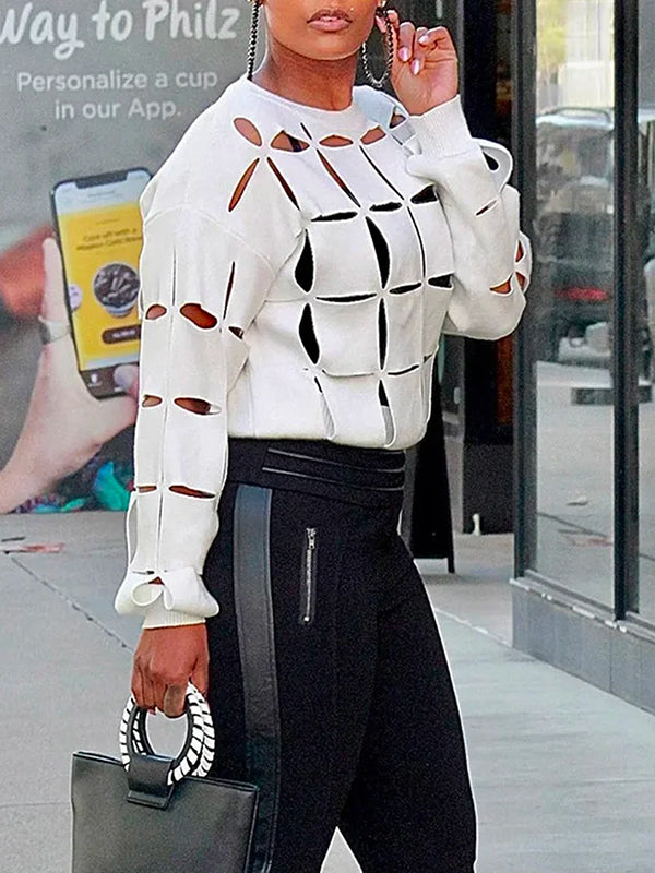 Momentlover Long Sleeves Loose Hollow Solid Color Round-Neck T-Shirts Tops
