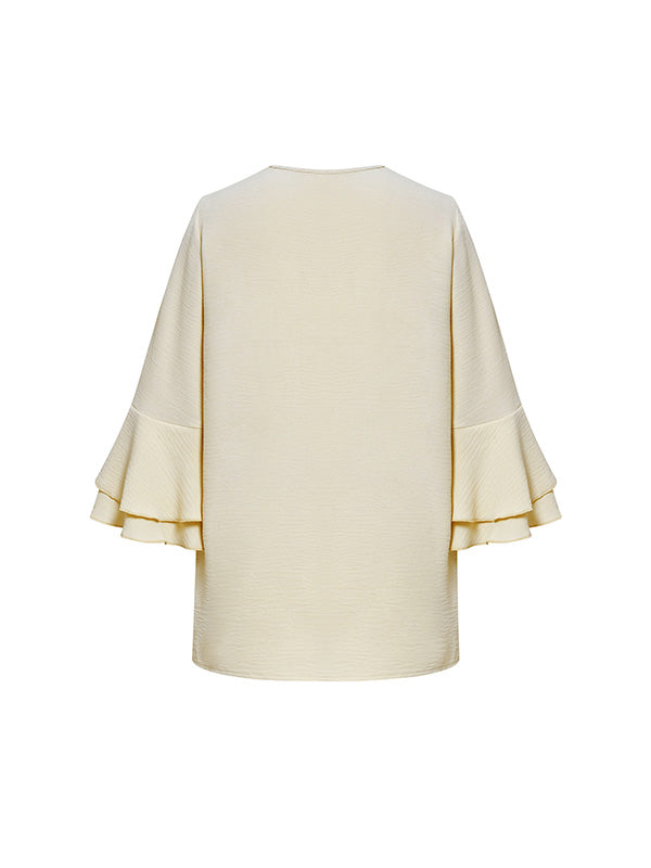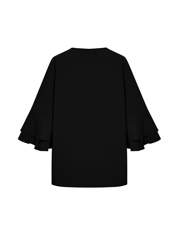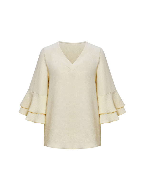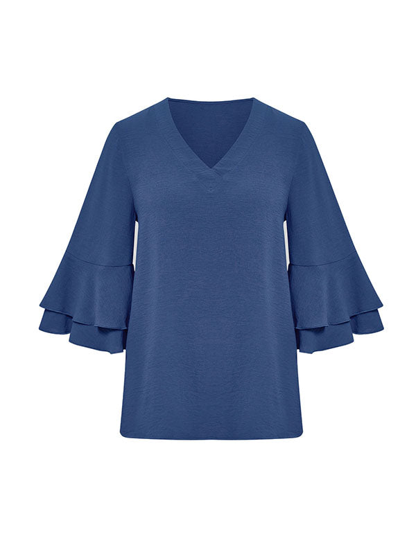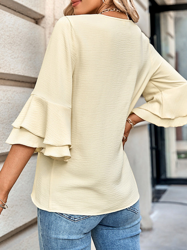 Momentlover Solid Color Ruffle Sleeves Loose V-Neck T-Shirts Tops
