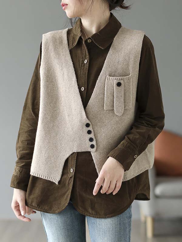 Momentlover Artistic Retro Sleeveless Irregularity Buttoned V-Neck Vest Top