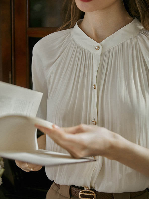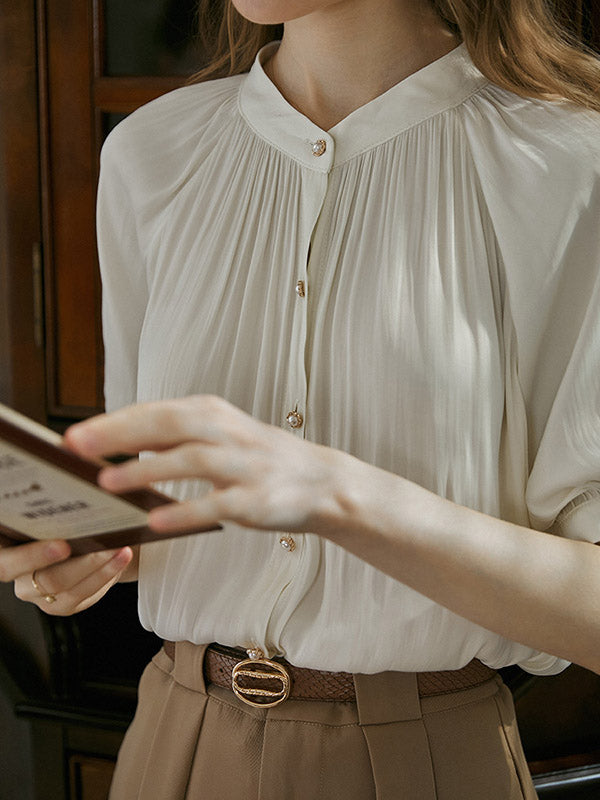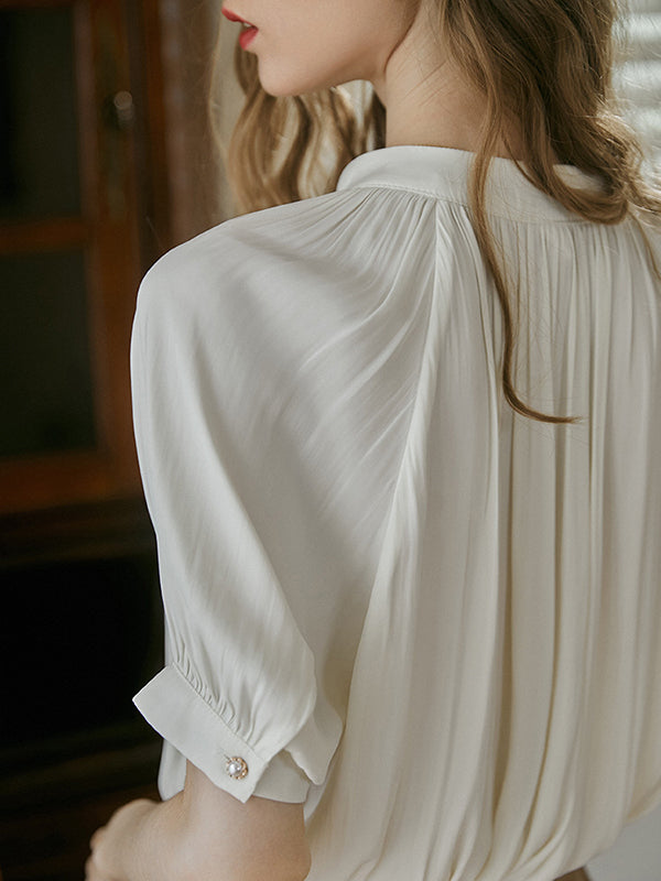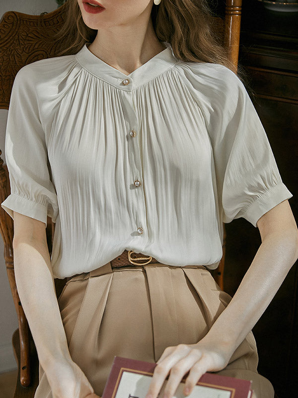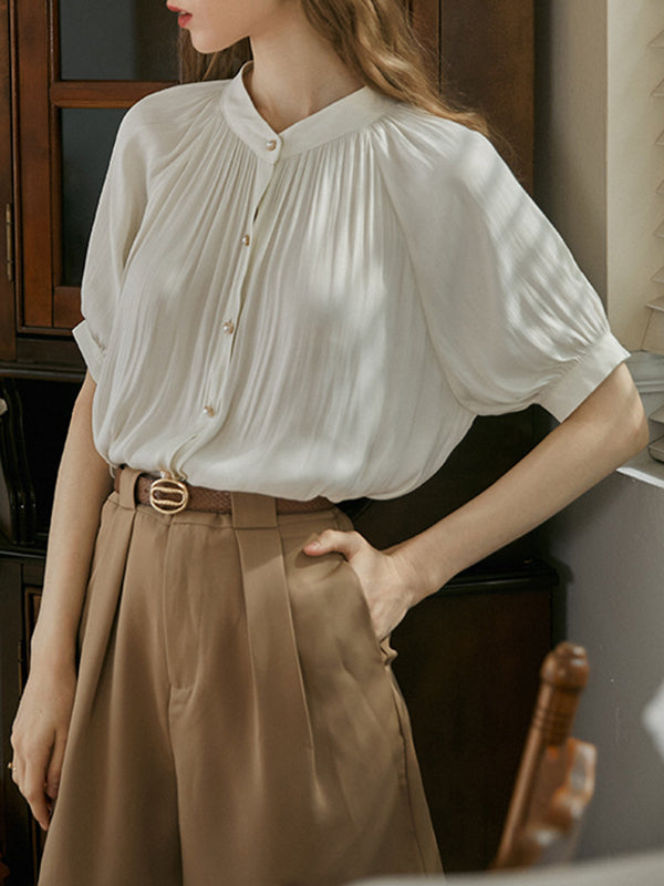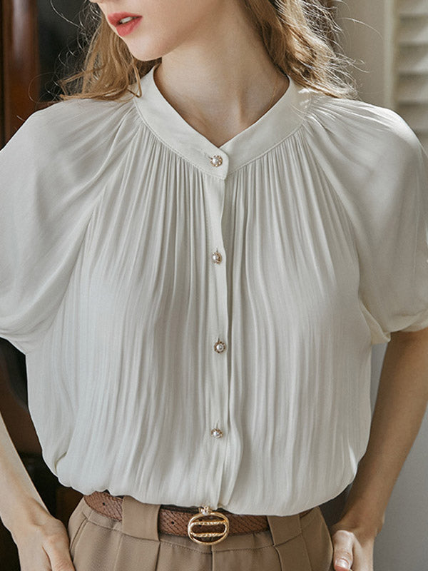 Momentlover Pleated Buttoned Short Sleeves Puff Sleeves Round-neck Blouses&shirts Tops