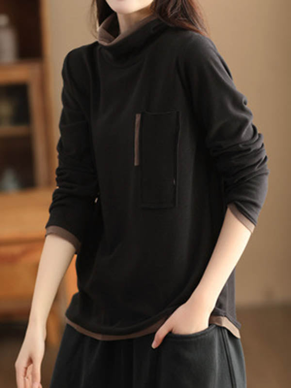 Momentlover Pockets Contrast Color Loose Long Sleeves High Neck T-Shirts Tops