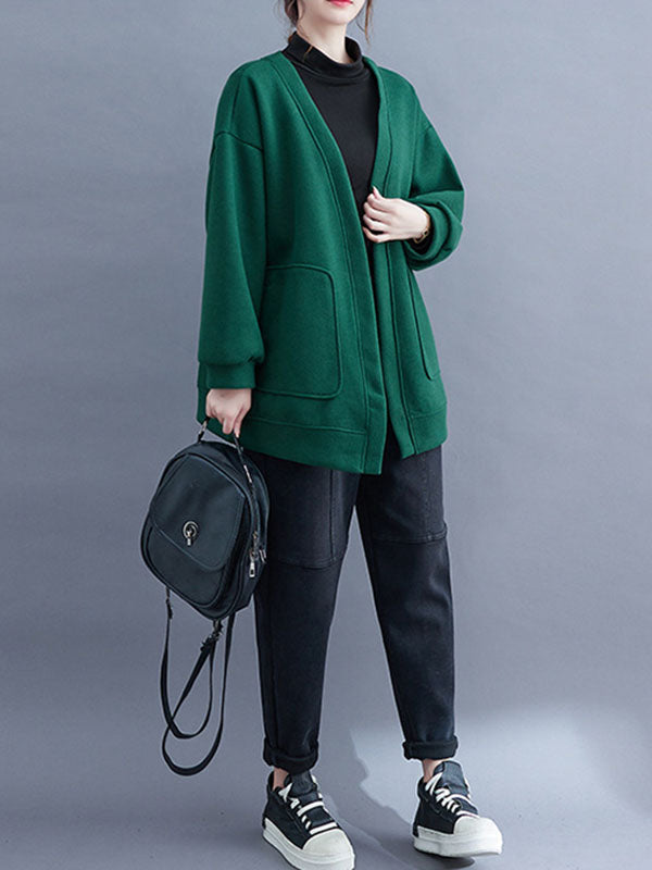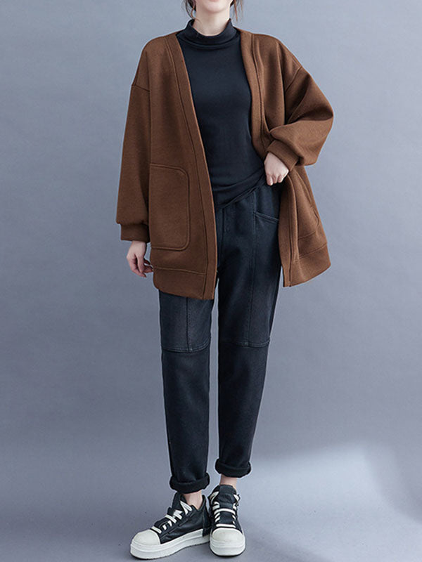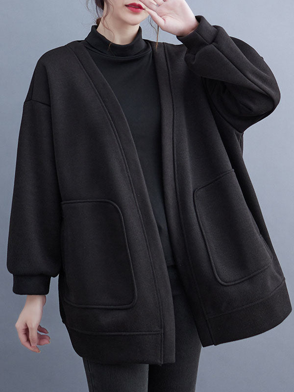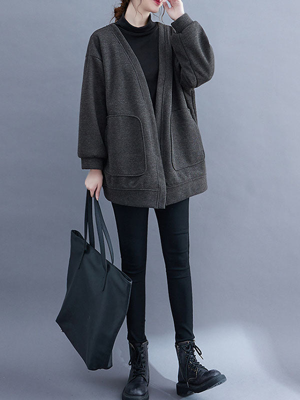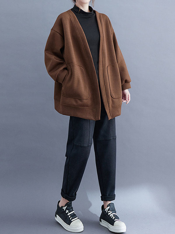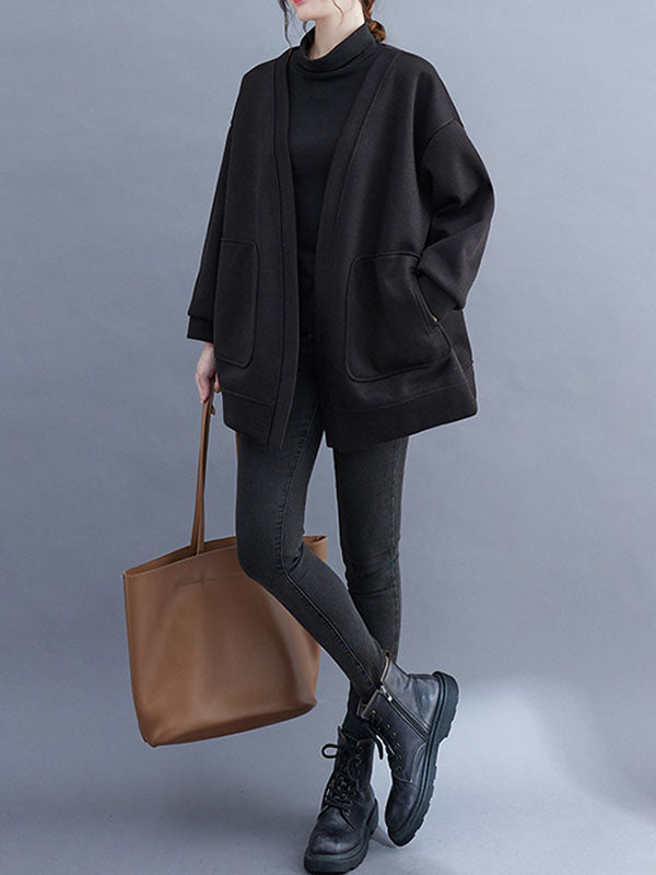 Momentlover Solid Color Pockets Loose Long Sleeves Collarless Outerwear