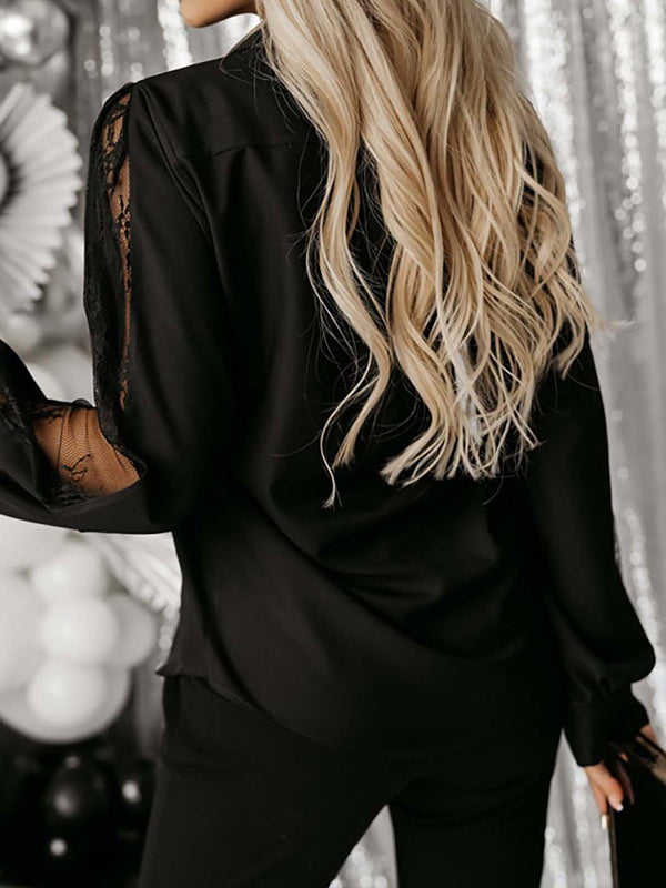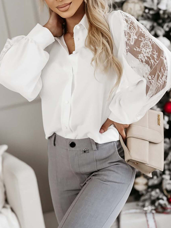 Momentlover Split-Joint Mesh Buttoned Loose Long Sleeves Lapel Blouses&Shirts Tops