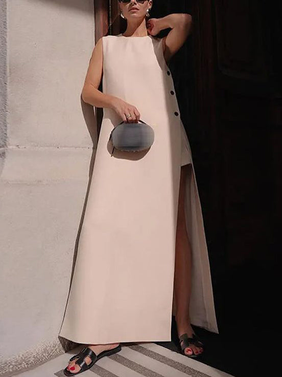 Momentlover Loose Sleeveless Solid Color Split-Side Round-Neck Maxi Dresses