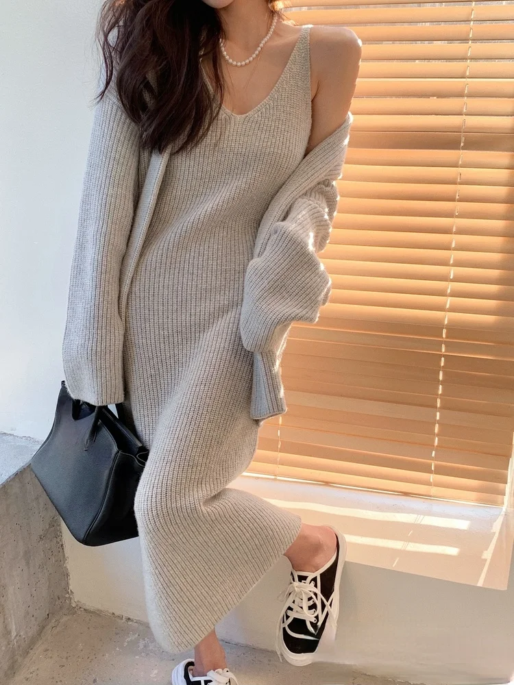 2 Piece Dress Set Women Casual Knitted Suits Korean Fashion Y2k Slim Pure Collor Sweater Dress Sets Party Autumn Cardigan