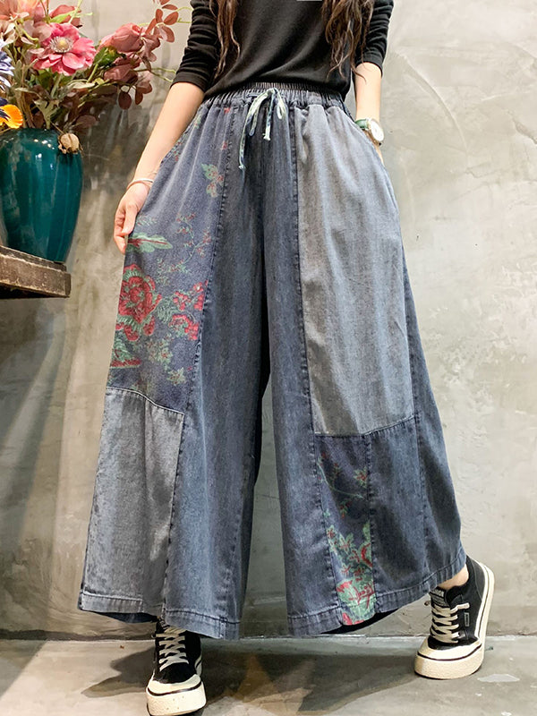 Momentlover Casual Wide Leg Loose Color-Block Bandage Embroidered Jean Pants Bottoms