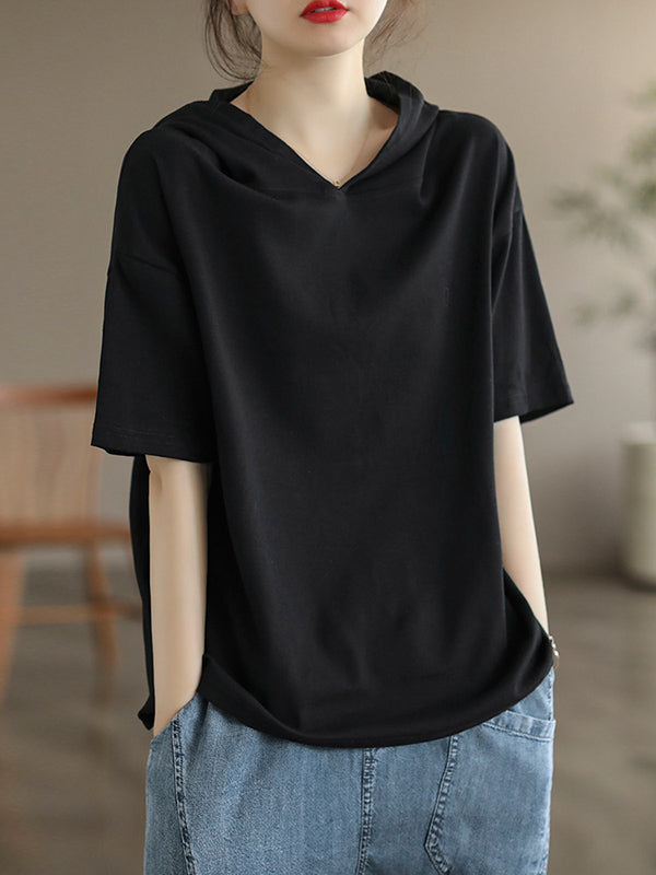 Momentlover Solid Color Hooded Short Sleeves Hooded T-Shirts Tops