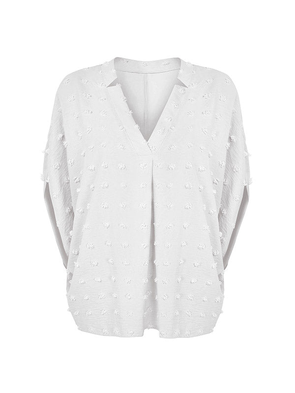 Momentlover Solid Color Jacquard Loose Half Sleeves V-Neck T-Shirts Tops