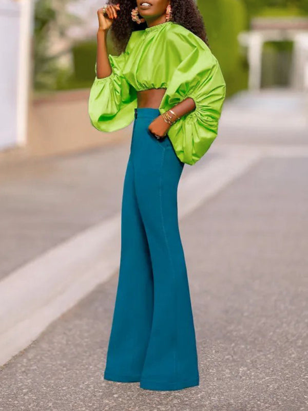 Momentlover Solid Color Puff Sleeves Loose Mock Neck Blouses&Shirts Tops