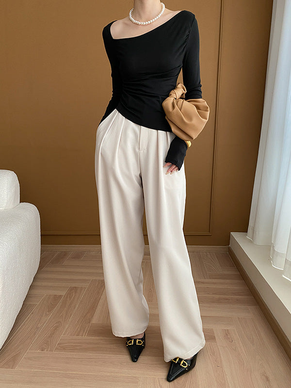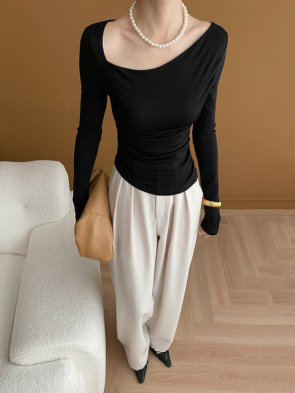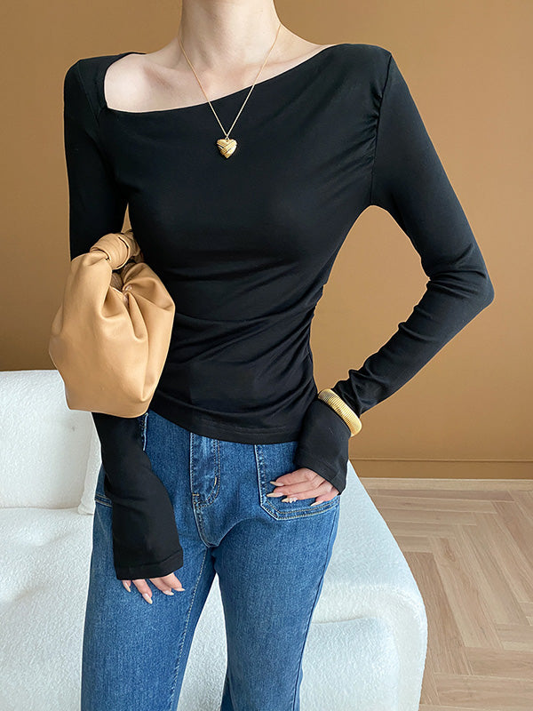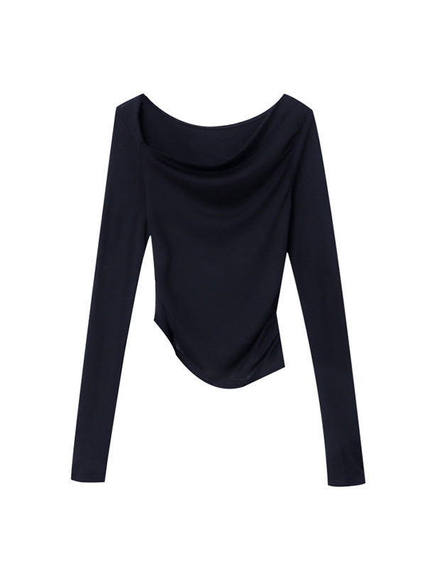 Momentlover Solid Color Skinny Long Sleeves Asymmetric Collar T-Shirts Tops